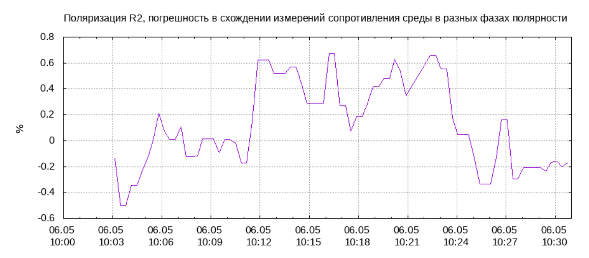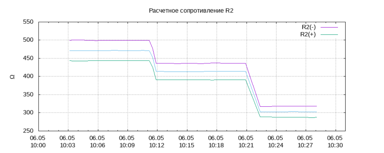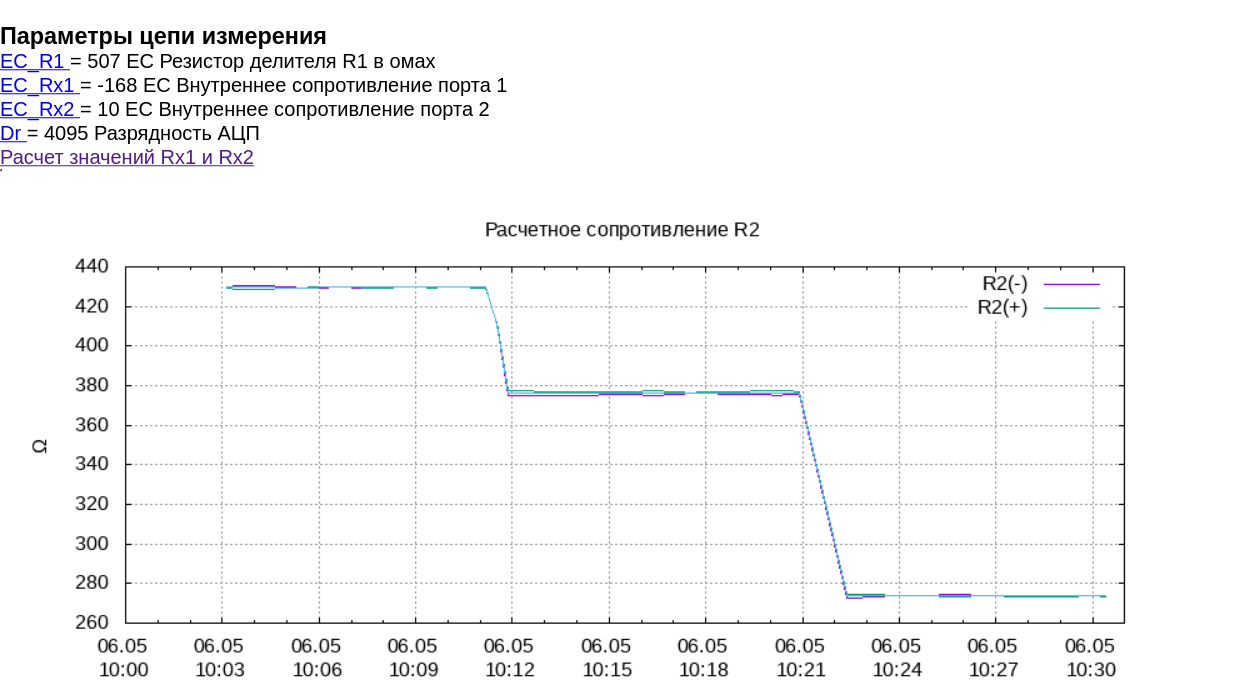 В этой части необходимо, управляя коэффициентами EC_Rx1, EC_Rx2 свести все линии сопротивления R2 за период калибровки на графике "Расчетное сопротивление R2" в одну единую линию, а в графике погрешности поляризации добиться расхождений в пределах не выше 1-2%