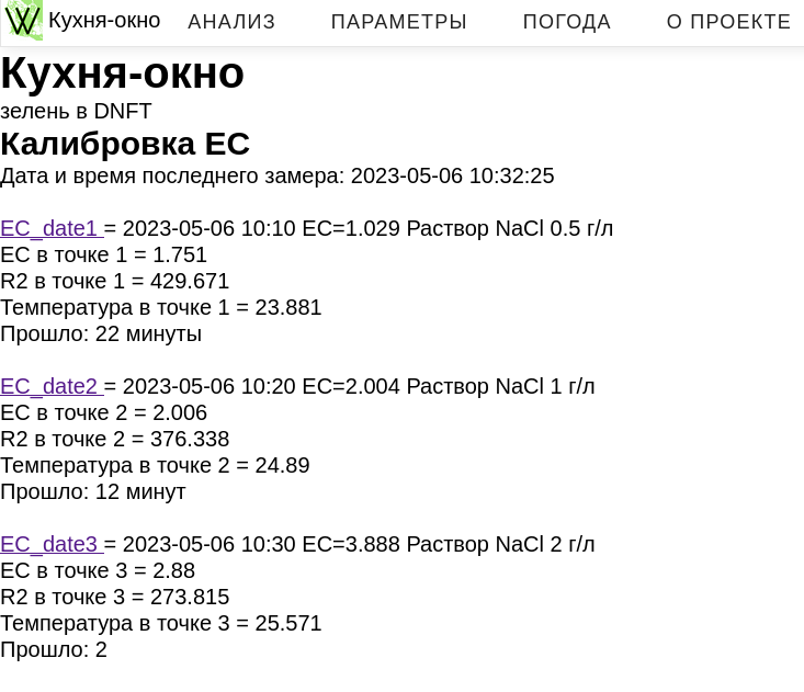 Надо понимать, что температура сильно влияет на реальную электропроводность, а ЕС является приведенной к 25 градусам электропроводностью. Это значит, что фактическое соответствие R2 и ЕС всегда будет отличаться, если температура не соответствует 25 градусов и желательно вручную менять значения EC_val до тех пор пока не будет полного или приемлемого соответствия контрольным точкам.