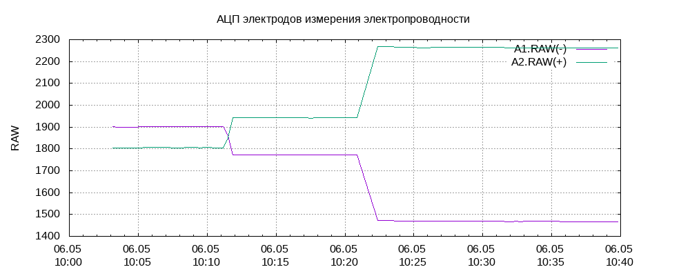 EC_R1 это значение резистора R7 на схеме. Его номинал 510 Ом. Его номинал подобран таким образом, чтобы при измерении раствора с ЕС=2 мСм/см электродом используемой конструкции, значения RAW АЦП, измеренные при разных фазах полярности сходились или были максимально близки по значению, что дает в этом месте наивысшую точность определения сопротивления [измерительным делителем напряжения](https://ru.wikipedia.org/wiki/%D0%94%D0%B5%D0%BB%D0%B8%D1%82%D0%B5%D0%BB%D1%8C_%D0%BD%D0%B0%D0%BF%D1%80%D1%8F%D0%B6%D0%B5%D0%BD%D0%B8%D1%8F)Тут видно, что значения RAW ацп пересекаются при значениях ЕС около 2 мСм/см