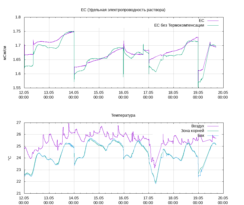 Дело в том, что значение электропроводности помимо концентрации солей довольно сильно зависит от температуры раствора и в среднем влияние температуры на показания EC составляет от 1% до 3% на каждый градус температуры. Все усугубляется тем, что температурное влияние зависит от конкретного состава раствора но эта зависимость настолько сложная, что учитывать ее математически не представляется возможным, да и о знании точного текущего состава раствора говорить не приходится.