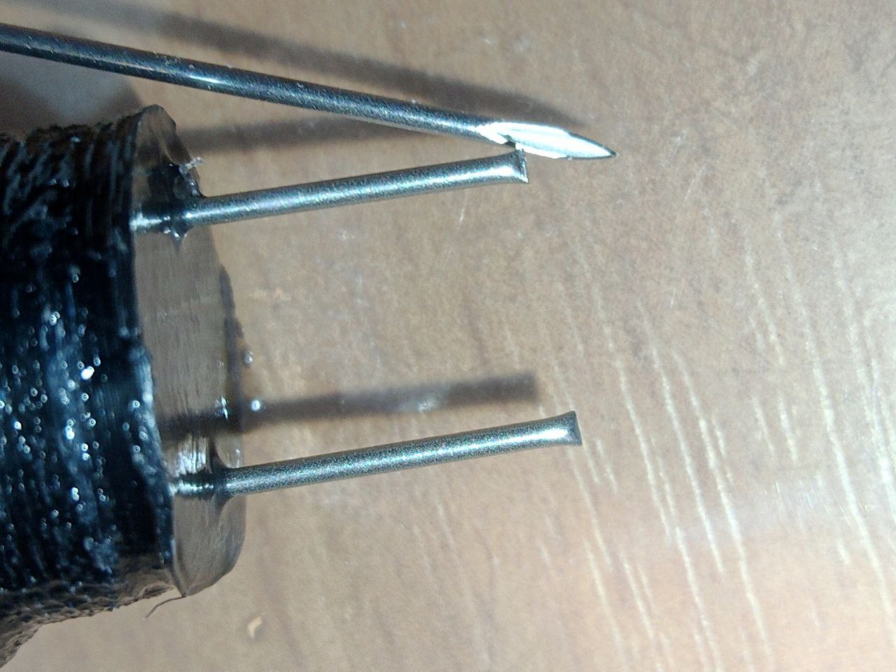 - Вставляем иглы в отверстие корпуса электрода до упора, размещаем NTC между ними в самый низ так, чтобы контакты не соприкасались.