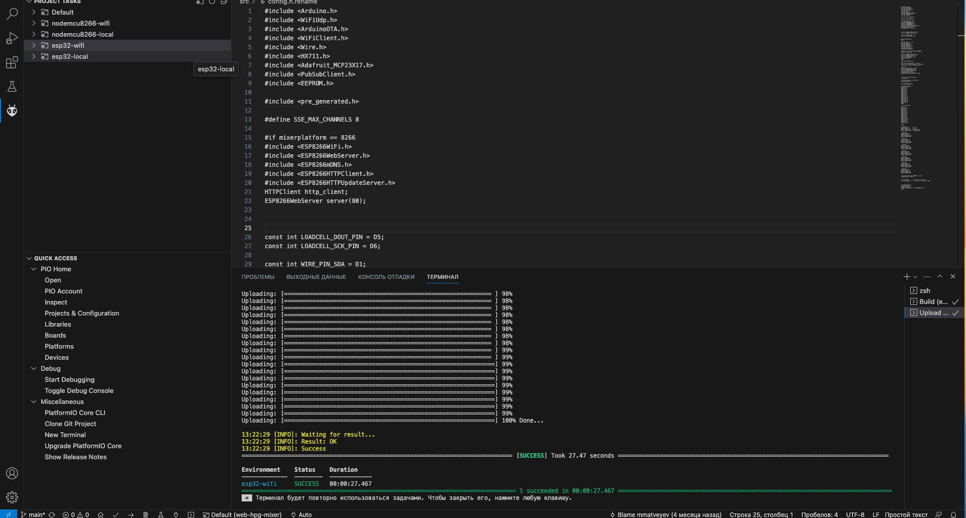- Подключите плату WEGA-MIXER к компьютеру по USB и прошейте ее через platformio.