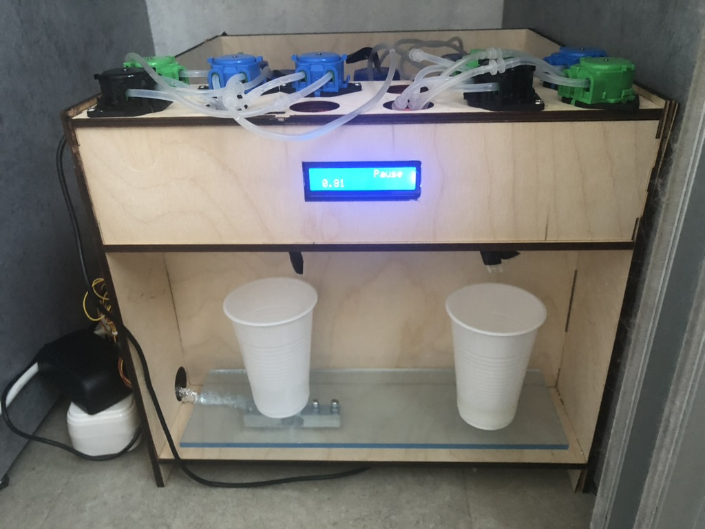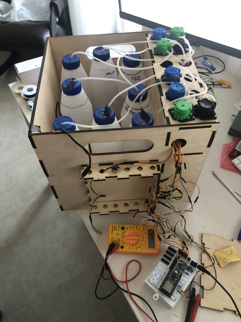 - Предусмотрите в корпусе выводы под кабеля, а так же где будет плата. К плате должно быть подведено питание от адаптера, плата в свою очередь питает насосы и замеряет вес.